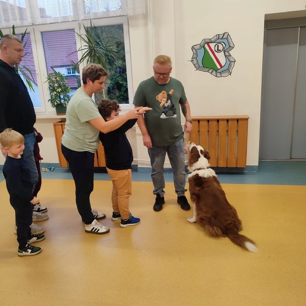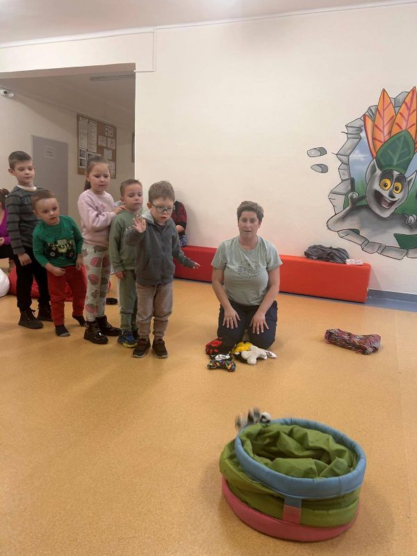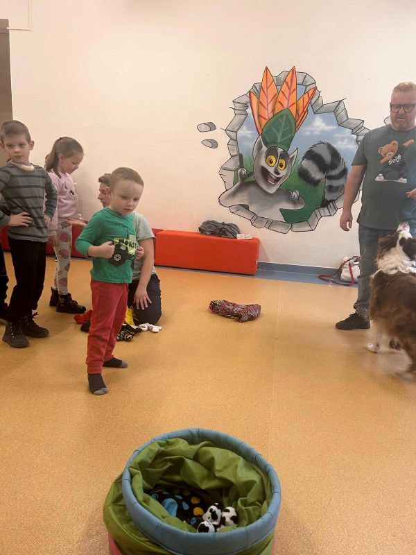 Dzieci z ogromną radością współpracowały z naszym czworonożnym przyjacielem, rozwijając różne sfery poznawcze, ucząc się współdziałania i nawiązywania relacji.