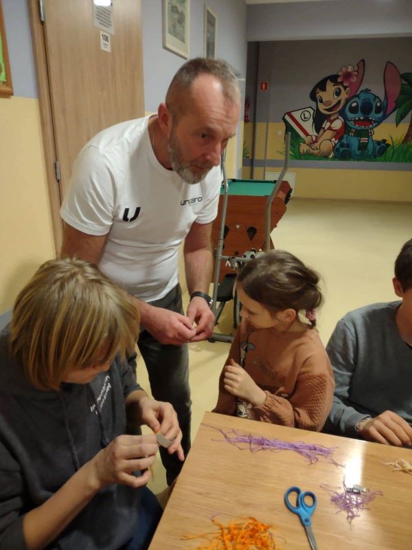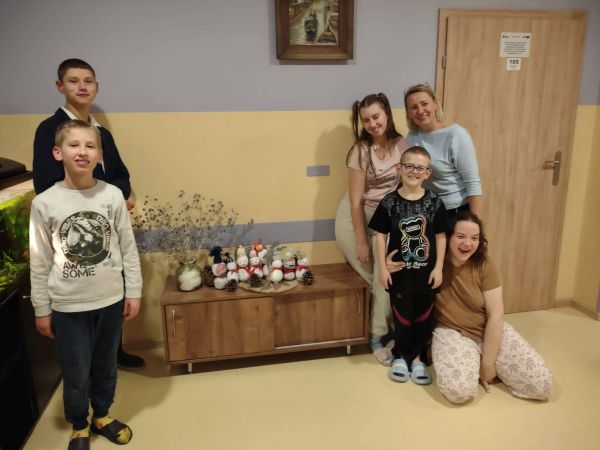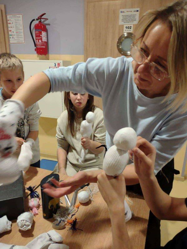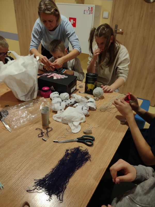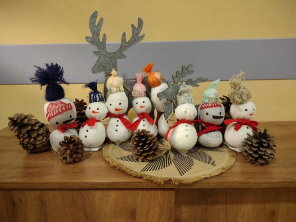 Podczas "Warsztatów szycia z Panią Edytą" wychowankowie z grup wychowawczych wykonali bałwanki. Wykorzystali białe skarpety, wełnę, igłę z nitką, otulinę, nożyczki, klej i flamastry. Wkrótce powstała przestrzenna dekoracja szafki z wesołymi bałwankami. "Warsztaty szycia z Panią Edytą" bawiąc - uczą. Dostarczają ogromnej dawki satysfakcji, a rezultaty pogłębiają wiarę wychowanków we własne siły i umiejętności. Dają radość szycia i życia ! Słowa uznania dla Pani Edyty