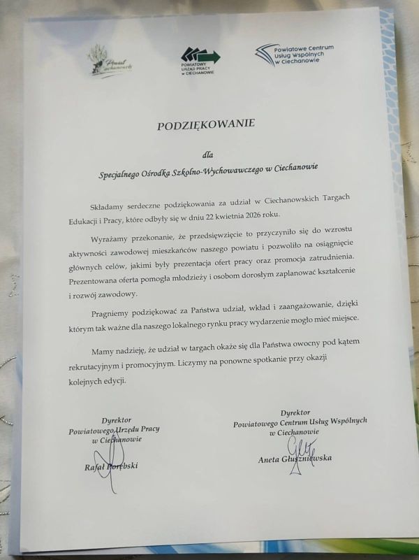 22 kwietnia 2026 r. SOSW w Ciechanowie, jak co roku brał czynny udział w Targach Edukacji i Pracy pod Honorowym Patronatem Starosty Powiatu Ciechanowskiego. 🎓🤝