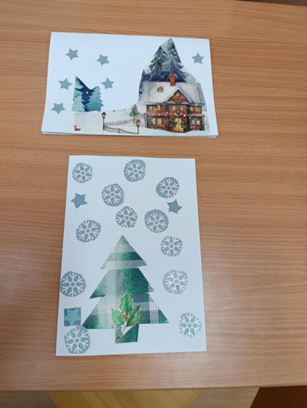 z książką w tle. Uczniowie wykonali również piękne karty świąteczne