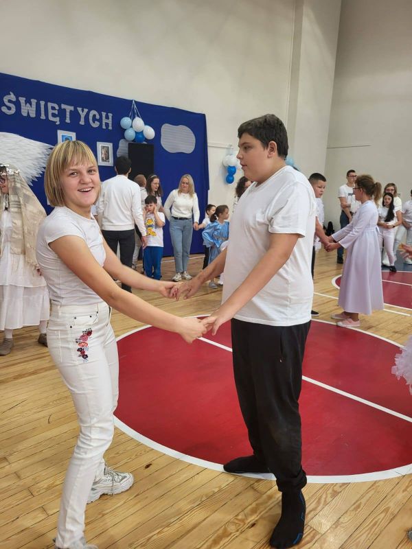 Uczniowie z radością opowiadali o świętych, za których się przebrali, a ich zaangażowanie zostało nagrodzone drobnymi upominkami. Nie brakowało również tańców i śpiewu przy rytmach religijnych piosenek — radość i wspólnota wypełniły całą salę!