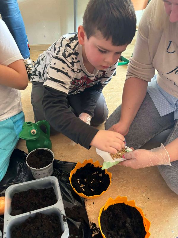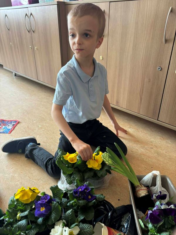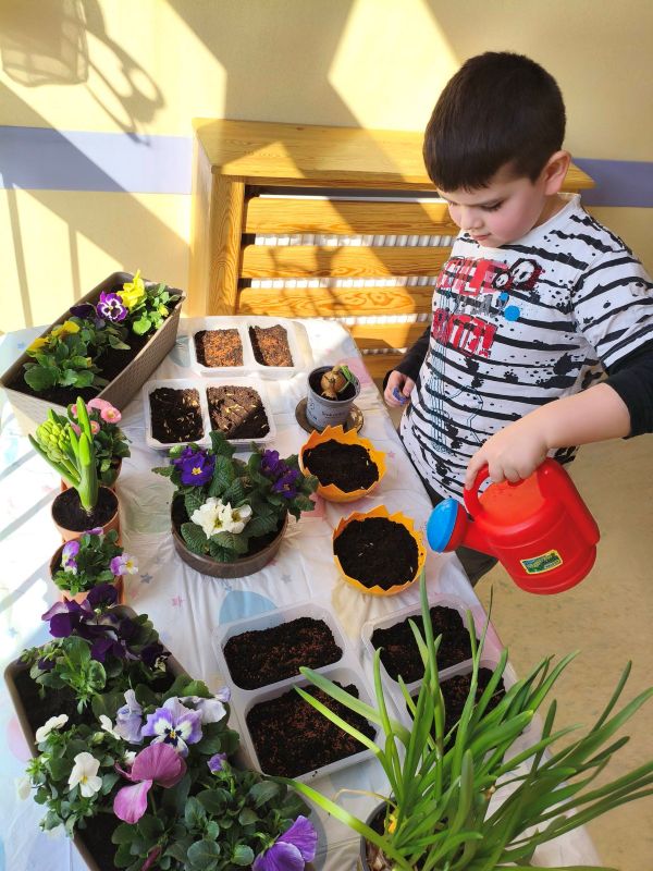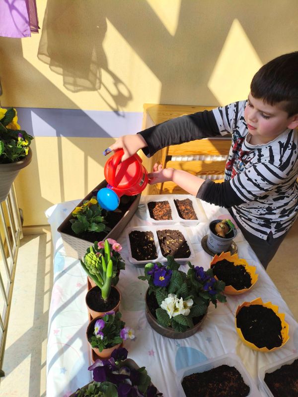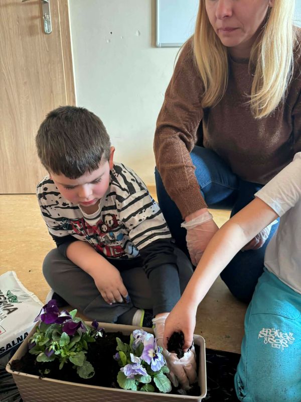 Misie i Krasnale stworzyły mały kącik przyrody – posadziliśmy bratki i prymulki, zasialiśmy rzeżuchę oraz owies, a także cebulkę na szczypiorek.