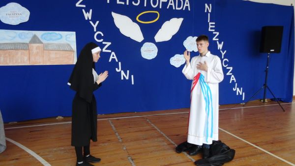 Motywem przewodnim był temat zajęć "Sztuka pomocą w modlitwie". Mogliśmy podziwiać malowidła ścienne i witraże, które przybliżały nam wydarzenia Kościoła i roku liturgicznego. Tą wyjątkową wizytę ubogacił proboszcz Parafii Fatimskiej ksiądz Jan Jóźwiak, który opowiedział nam wiele o historii kościoła i o nowo ustanowionym Diecezjalnym Sanktuarium św. Jana Pawła II.