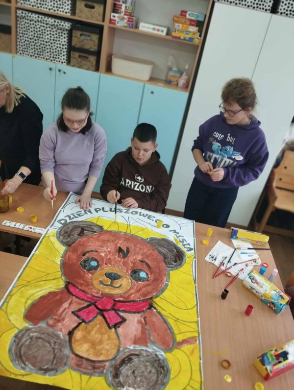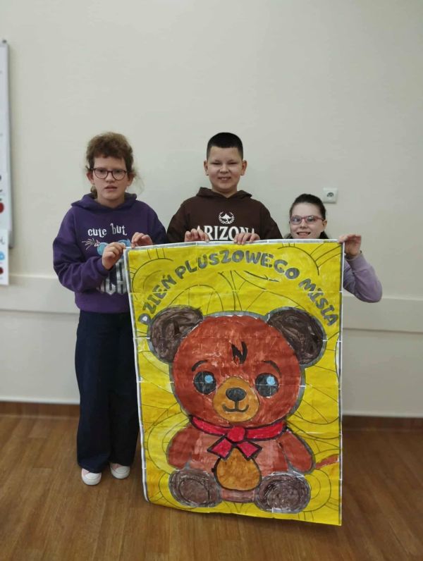 Wysłuchały fragmentów książki o Kubusiu Puchatku, poznały inne literackie misie dzięki prezentacji multimedialnej, a na końcu wspólnie przygotowały duży, kolorowy plakat przedstawiający misia.